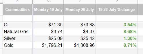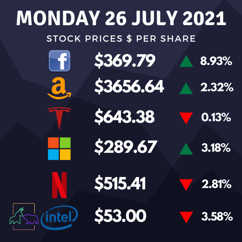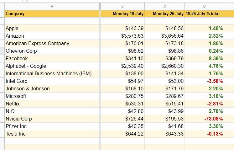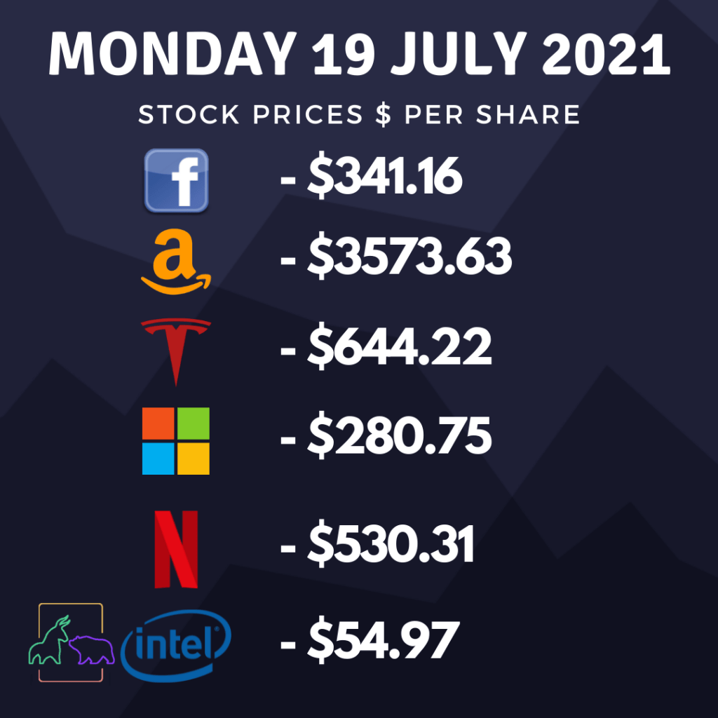 The image above is the second batch of prices, on the week starting 26 July 2021. Here, you can see slightly different prices and either an increase/decrease percentage % from last weeks prices. Amazon’s price is trending upwards yet again, as are Facebook and Microsoft and it doesn’t look like they are going down any time soon. Intel dropped 3.58% despite the difference being less than $2, and Netflix’s decrease continuing yet again.